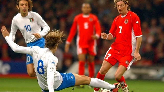 For that opening game away to Finland, with Bellamy carrying an injury and requiring treatment, Hughes took the decision to charter him a flight out, ‘I only came off the bench for 15 minutes , the fact that I was there at all was the final proof that the days of farce and amateurism under Bobby Gould were over.’ Wales would leave Helsinki with a hard fought 2-0 win ready for their second fixture, a mouth-watering clash with the Italy of Buffon, Cannavaro, Nesta, Del Piero and Pirlo at the Millennium stadium. Prior to the game, Hughes promised ‘we’ll convert Wales to football,’ as the 70,000 tickets sold out in days and were reaching ten times the value on the black market. The Manic Street Preachers provided pre-match entertainment alongside an emotional appearance from former Welsh international John Charles. Savage describes an ‘explosion of noise and colour’, on a night, which in Harston’s words was ‘as emotional as any I have ever known.’ Wales would emerge from the tie 2-1 winners. For Bellamy, who scored the winning goal, ‘that was one of the best nights of my career…because we deserved it.’ Wales lined up in a 4-5-1 formation which Hartson described as ‘near perfect…when we attacked it was 4-3-3 and when we defended 4-5-1…Sparky told me, just get yourself on the half way line and we will have ten men behind the ball, then they’ll have to break us down. When we attacked we threw men forward; Davis, Bellamy, Giggs, Savage and Pembridge supporting me.’ The Western Mail described the events as ‘A Night of Ecstasy’ and one of Wales’s greatest sporting moments. Wales rounded off 2002 with a 2-0 victory away to Azerbaijan and had climbed 52 places in the FIFA rankings. Hughes was named Wales’s sports personality of the year. Returning to qualification action in March 2003, they again made light work of Azerbaijan with a 4-0 home victory. Going into that summer, Wales were top of their group with a hundred percent record. They would not win again for the rest of the campaign.